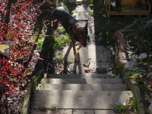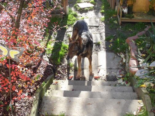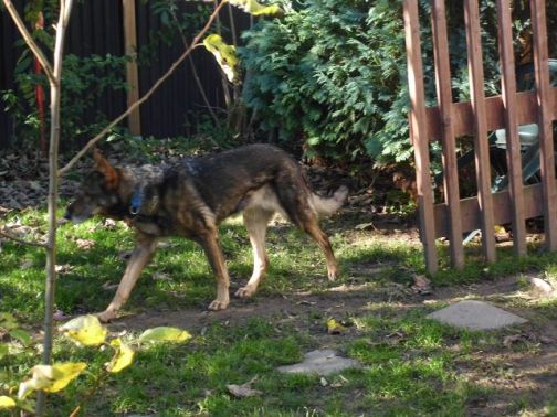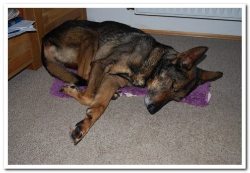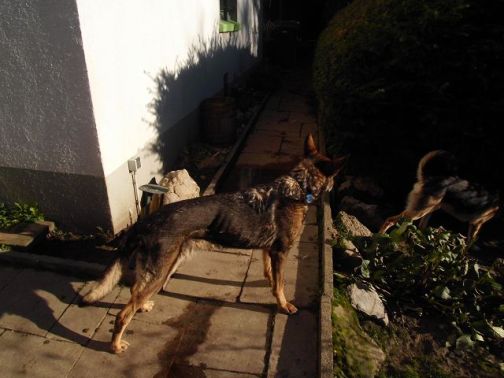 ist sehr abgemagert, weil sie vor Kummer nicht fressen mag. Sehr schwache Hinterlaeufe, teilweise durch Muskelschwund. Bravia trauert sehr um den Verlust ihres Herrchens und