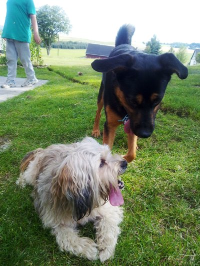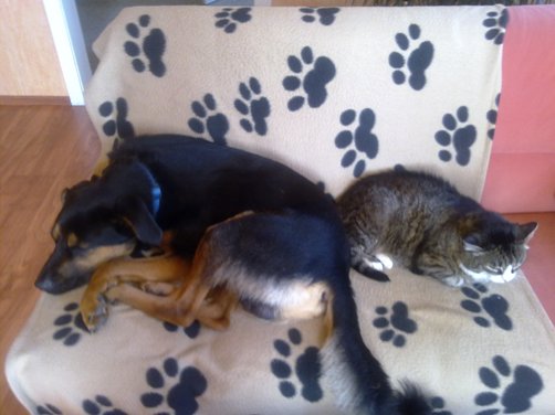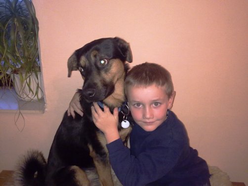 hier wie gewünscht ein paar Fotos von Angelo. Eins aus dem Urlaub, eins aus der Schule als Herrchen Nick sein Haustier vorgestellt hat (er hat sich prima benommen), eins mit Herr-chen Kevin, eins mit seiner Freundin Luna und eins das zeigt wie er sich mit Katze Luzi die Tierdecke auf dem Sofa teilen muß:)