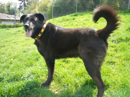Verträglichkeit mit Artgenossen: Rüden neutral und friedfertig, Hündinnen wären lieber, Katzen unbekannt