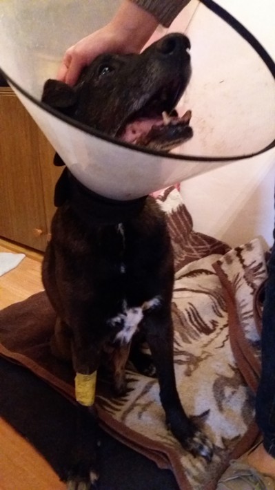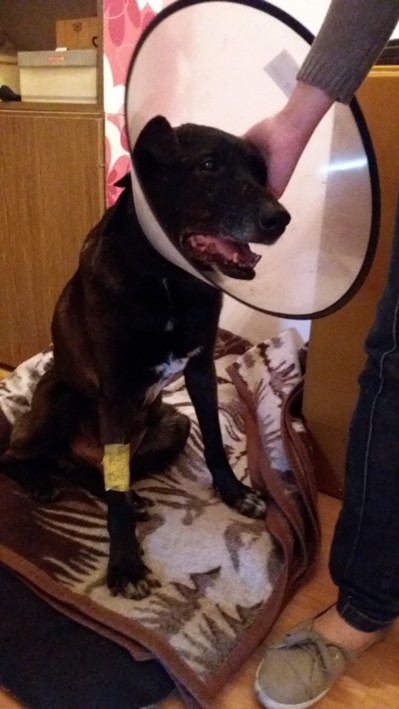 Die OP-Wunde heilt zu aber den Schutzkragen muss er weiterhin tragen (sonst leckt er die Stelle zu viel).