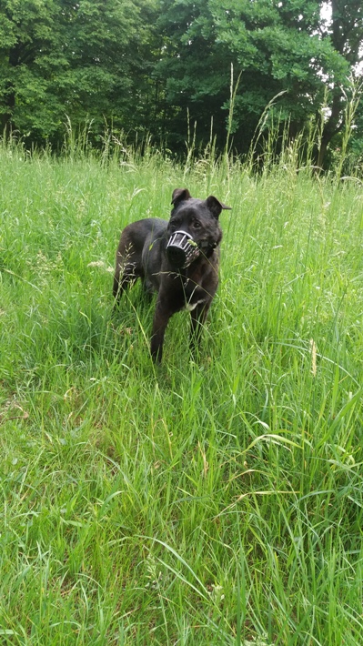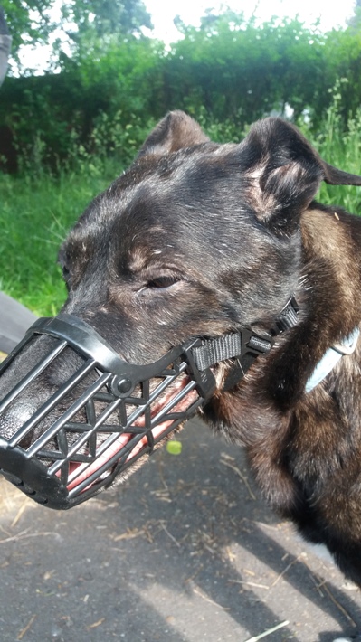 Demos geht es gut. Er muss den Maulkorb tragen, weil waehrend der Gassirunde verhaelt er sich wie