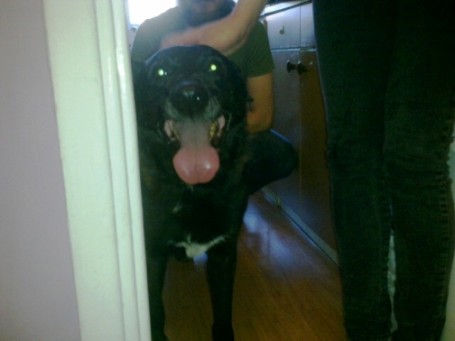 Das Herrchen von Demos ist nachts zurueck gekommen, Demos hat sich riesig gefreut und er hat vor Freude sehr viel 'getanzt' . Dann ist er von der ganzen Aufregung durstig geworden und hat Wasser getrunken. Dabei hat er sich verschluckt. Kurz danach wollte er erbrechen, aber es ging nicht. Demos