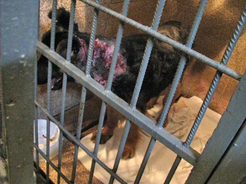 durch Verletzungen großflächige blutige Hautläsionen. Die Fotos sind