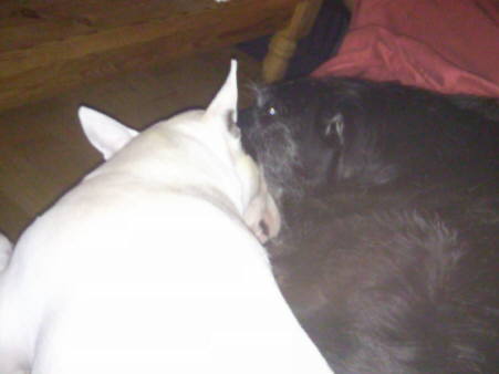Endlich angekommen: Mein neues Zuhause. Bei hundelieben Zweibeinern und einer Hundedame. Die Zweibeiner hab ich sofort um den Finger gewickelt und die kleine Bullterrierhündin Lola gab sich zwar erst etwas reseviert - entdeckte und verfiel aber schließlich rasch meinem Charme. Intern nennt man uns schon die "Unzertrennlichen".