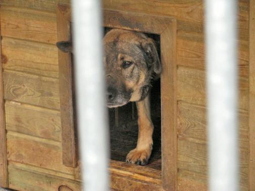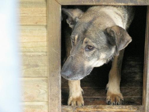 Diese sanfte Hündin traut sich aus ihrer Hütte nicht mehr heraus. Sie hat vollkommen resigniert.