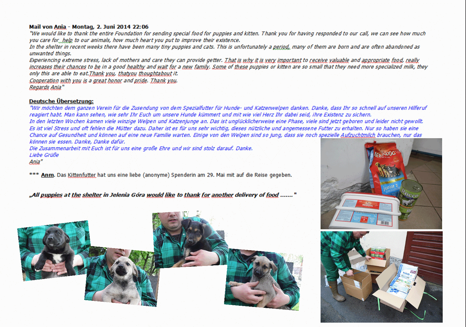 benen Restbetrag können wir nun (unter Hinzurechnung bereits eingegangener weiterer Spenden) noch mal das so dringend benötigte Welpenfutter bestellen. Herzlichen Dank !