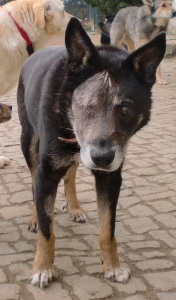 " Unser Hundeopi Jazz ist ein lieber Rüde, der gelernt hat mit seinen Handicaps zu leben. Trotz Blindheit und Taubheit kommt er hier im Tierheim gut klar. Er vertraut hier viel auf seine Nase. Jazz hat seinen festen Schlafplatz in der alten Futterküche. Den Weg von dieser bis nach draußen kennt er und orientiert sich unter anderem an den Wänden. Er läuft zwar langsamer als die anderen Hunde, aber dennoch sicher. Streicheleinheiten mag er sehr und genießt diese auch in vollen Zügen. Mit den anderen Hunden hat er keine Probleme. Die meisten verzeihen ihm auch einen ungewollten Anrempler. Ist er draußen und möchte wieder rein, macht er sich bemerkbar, wenn die Tür verschlossen ist. Auch Spaziergänge mit Jazz sind möglich. Ein Vorankommen ist zwar nur langsam möglich, da er ja den Weg, Untergrund und Hindernisse nicht sieht, aber er genießt es. Jazz - ein Hund, der gelernt hat mit seinen Handicaps zu leben und seine Lebensfreude, trotz großen Einschränkungen, noch nicht verloren hat."