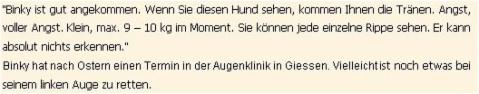 Ich kann es mir nicht vorstellen , was der arme Binky im Leben durchgemacht hat . Binky hat die Menschen von der schlimmsten Seite kennen gelernt. Trozdem ist er ganz lieb und freundlich geblieben. Waehrend der Untersuchung der Augen ( bestimmt schmerzhaft ) hat Binky mit der Dankbarkeit die Haende von der Aerztin geleckt.