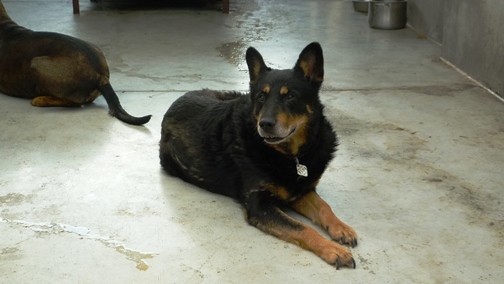 Inzwischen haelt er sich aus Angst vor seinen neuen Zwingerkollegen wieder nur in der Hundehuette auf !