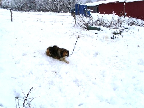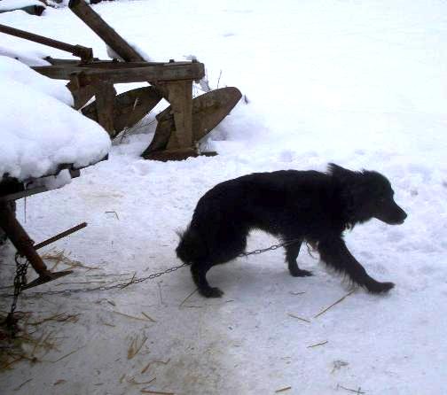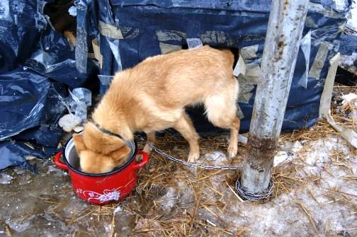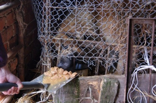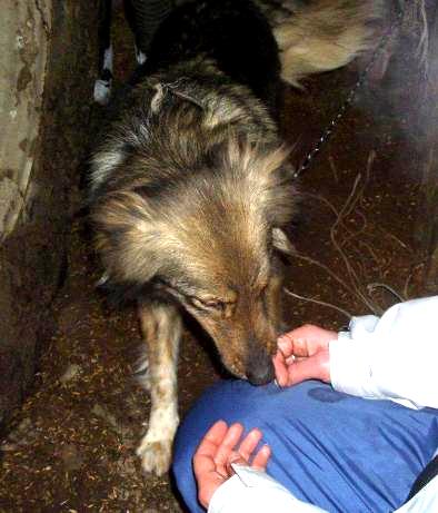 Hier füttert ein Freiwilliger den Hund mit einem Spaten, weil man an den Futternapf kaum herankam ...