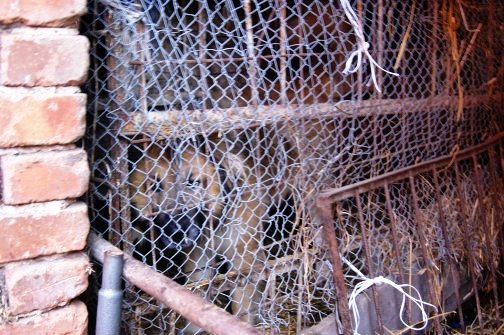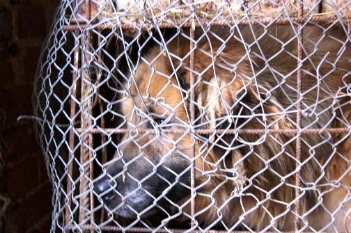 in ein Kaefig "eingeschweisst". Der Kaefig war nur unwesentlich groesser als der Hund und stand tagein, tagaus fast seit zwei Jahren im Freien. Der Hund wurde