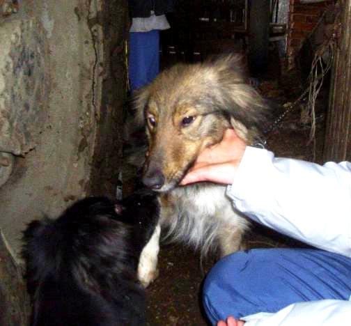 der Hund bei ihr auf dem Gnadenhof, zeigt alle Risse, die ihm der Eigentuemer zugefuegt hat (Angst vor Fremden, Agression gegenueber Maennern, Stoecken, ploetzlichen Bewegungen usw). Seine Adoption wird wahrscheinlich niemals
