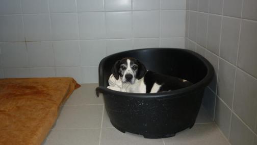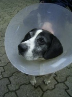 Pascal ist gerade von einem anderen Tierheim zu uns gekommen. Dort war er von anderen Hunden leider ziemlich schlimm gebissen worden, deshalb muss er im Augenblick noch einen Trichter tragen.