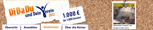 Wir möchten alle Besucher unserer HP nochmals darum bitten, uns ihre Stimmen bei der Aktion "DiBaDu und Dein Verein" zu geben. Bisher haben sich nur ganz, ganz wenige die
