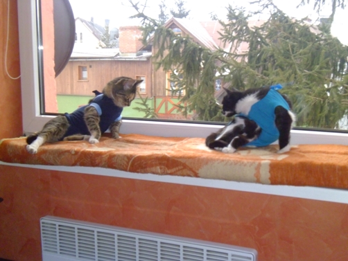 Die zwei naechsten wichtigen Faelle sind zwei Katzen. Die eine wurde an einer Grundschule mit einem aufgerissenen Bauch gefunden. Sie hatte eine schwere OP, der Bauch wurde zugenaeht und sie hat eine lange Rekonvaleszens hinter sich. Sie ist bei mir zu Hause und dort wird sie wahrscheinlich schon bleiben. Das war auch ein sehr grosse Ausgabe.