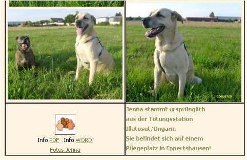 Jenna sucht ein Zuhause ohne große Hektik mit viel Geborgenheit und Liebe. Gegen Kinder hat sie nichts einzuwenden, sie sollten aber schon Hundeerfahrung haben und nicht unter 12 Jahre alt sein. Jenna wird als ein ganz tolle Hündin beschrieben, die ihrem Pflegefrauchen nicht von der Seite weicht. Jenna benötigt wegen einer leichten HD ein Zusatzpräparat zum Futter. Gegen eine Futterallergie wurde sie desensibilisiert, sie frisst ohne Probleme Sensitiv-Futter.