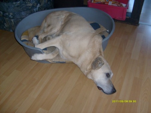 Jenna leidet nach Aussagen des behandelnden Tierarztes an beidseitiger HD und unter Arthrose. Seit einigen Wochen bekommt sie nun Schmerzmittel bzw. Entzündungshemmer, wodurch sie bereits wieder besser laufen kann.