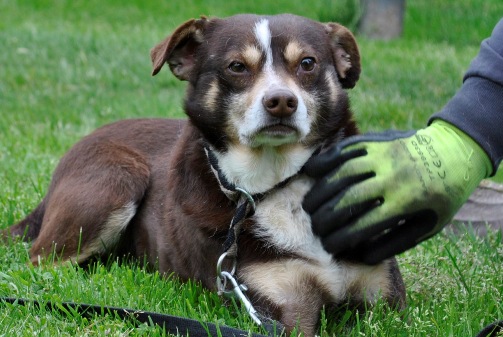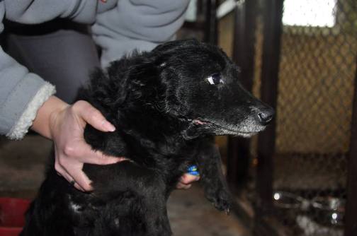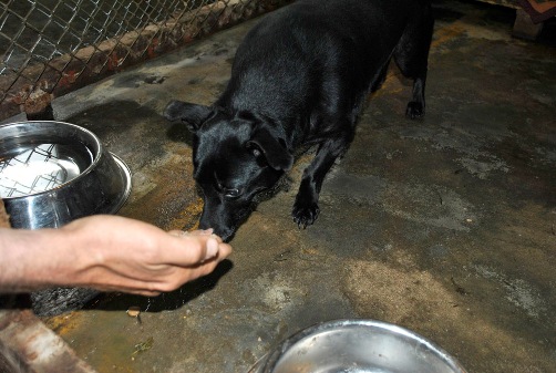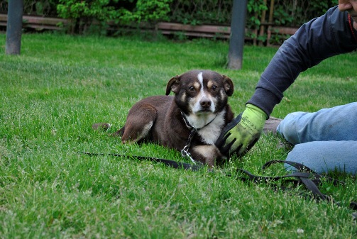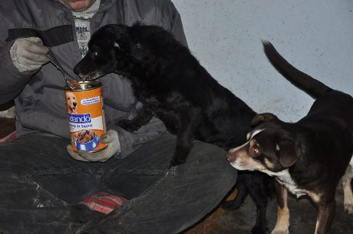 Pietaszek ist einer der beiden Hunde, die erst bei der zweiten Aktion eingefangen werden konnten. Er ist sehr ängstlich und reagiert mit einer panischen Angst auf Menschen die ihm fremd sind. Langsam kommt er aber, wenn ich ihn aus der Hand füttere.