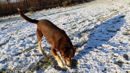 Der Hund auf dem Foto ist Dingo, der derzeit bei Milena lebt.
