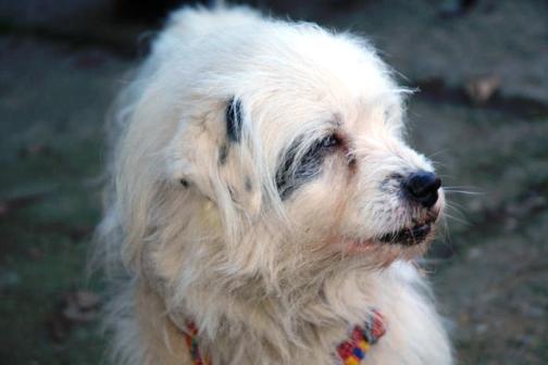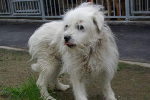 Elvis lahmt (wegen einer Deformation des Schulterblattes) und hat Atemprobleme. An seinem Hals fehlt ringsum das Fell, was auf eine frühere Kettenhaltung schließen lässt. Er reagiert auf schnelle Hand- und Fußbewegungen panisch und schnappt dann auch mal zu. Wir vermuten, dass es sowohl mit seiner traurigen Vergangenheit als auch mit der beginnenden Blindheit und Taubheit zu tun hat.