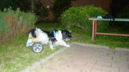 Der Tumor wächst stetig weiter und durch den Druck auf die Wirbelsäule ist Amisia inzwischen leider an beiden Hinterläufen gelaehmt. Sie hat einen Rollwagen gespendet bekommen, mit dem sie sich ganz gut fortbewegen kann.