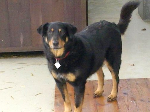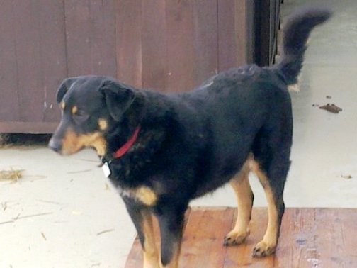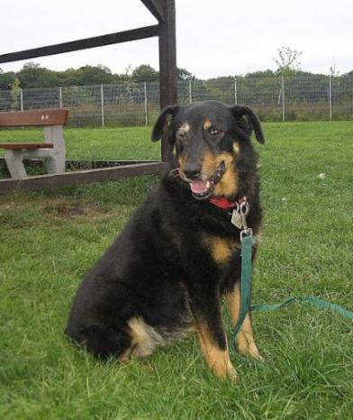 Die große schwarz-braune Hündin ist stubenrein und bereits an das Fahren im Auto