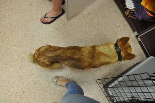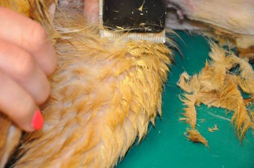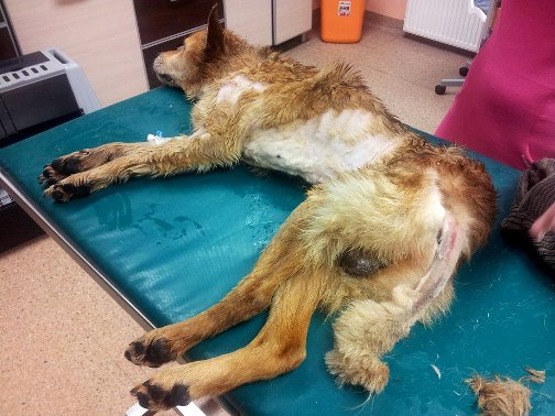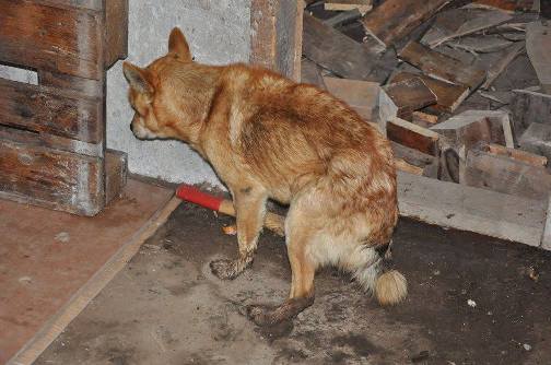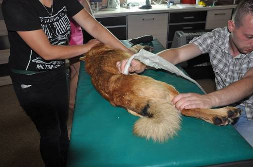 Der Hund war extrem abgemagert, fast bewusstlos, und hatte an sich eine enorme Anzahl von Madeneier, die wir an manchen Stellen zusammen mit dem Fell entfernen mussten (wir waren uns alle einig, dass die Larven Ihn innerhalb der nächsten Tage
