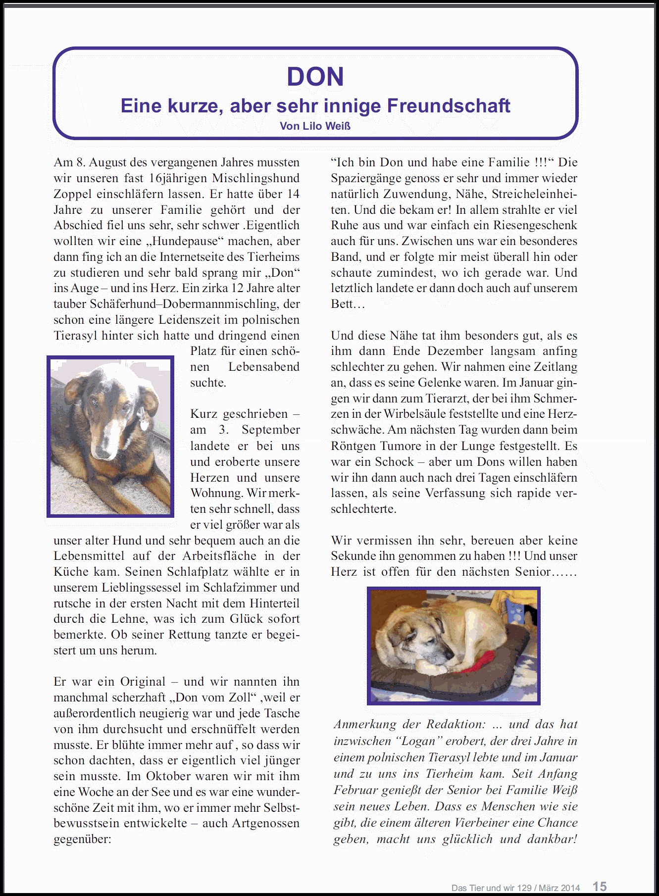 hatte. Ende Juni bekam Don den ersehnten freien Platz im Tierheim B. und es ist einfach